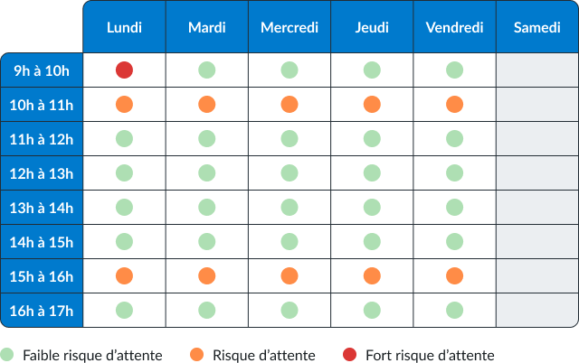 Pour éviter l'attente, consultez les heures d’affluence ci-dessous et privilégiez les créneaux les moins chargés (points verts) :
