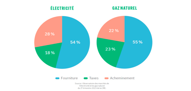 Les prix de l’énergie intègrent trois composantes : d’une part, la fourniture, dont le prix peut varier d’un fournisseur à l’autre et, d’autre part, l’acheminement et les taxes et contributions, que tous les fournisseurs d’énergie répercutent.