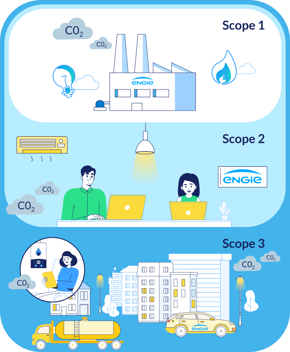 - Scope 1 : les émissions directes (chez ENGIE, la production d’électricité)